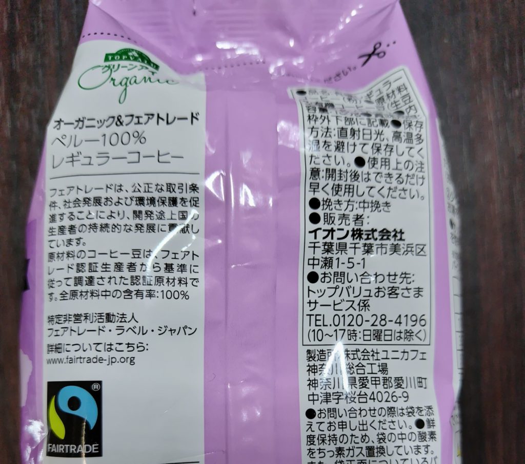 製品名にあるフェアトレードとは何かというと、パッケージ裏に書かれているのですが、要はとにかく安く買おうとするのではなく、適正価格で買い取り、生産者を守ろうとする仕組みのようです。価格だけではなく、生産者の労働環境が適切かどうか、児童労働や強制労働がないかなど、倫理面が守られているかを確認しているようです。また、環境保護にも配慮されているようです。