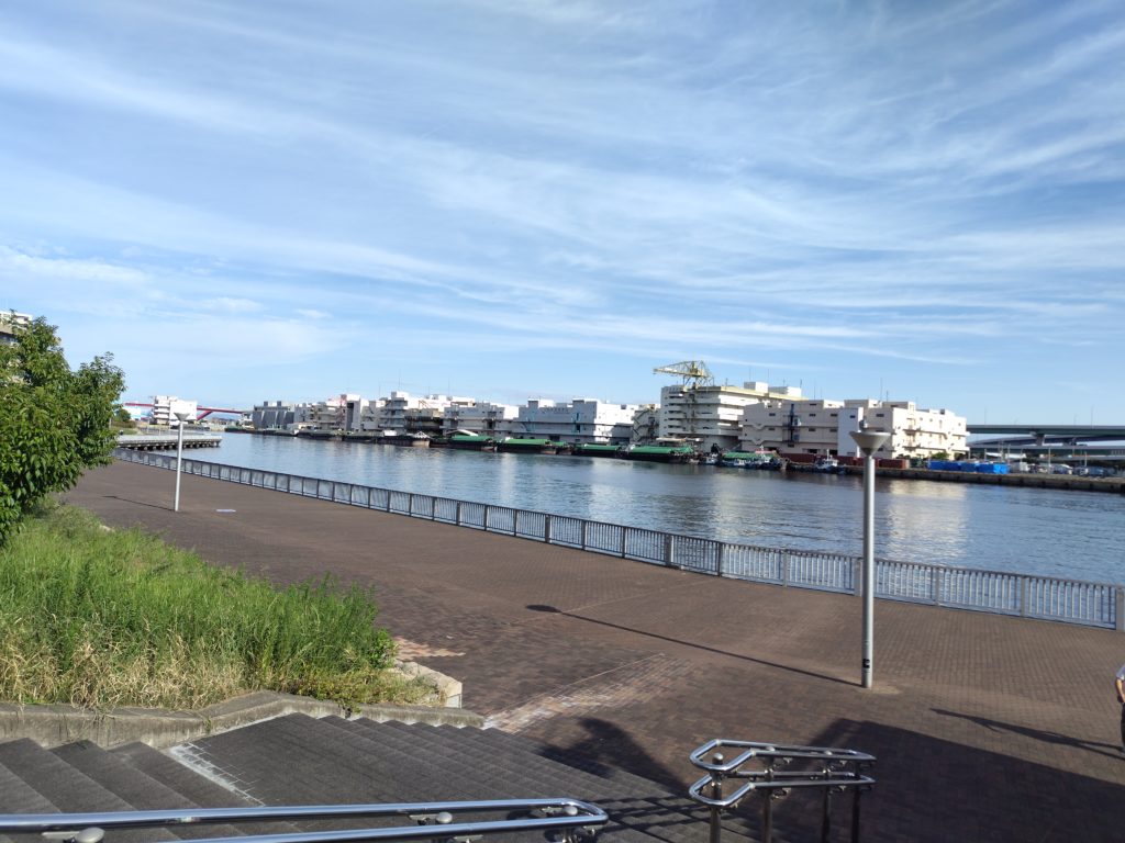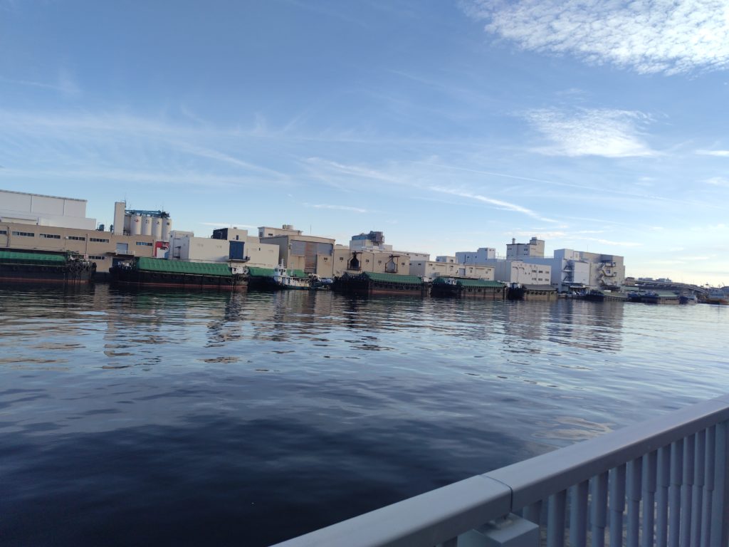 I was able to take a nice, long break, and as the sun began to set, I walked along the Harbor Walk again. The view on the way back, walking westward, is as the pictures below. It seems this area was historically an industrial zone, and across the water, you can see ships with a distinctive appearance, hanging tires on their sides. Seeing this scenery, which hasn’t changed from long ago, made me feel calm and settled.