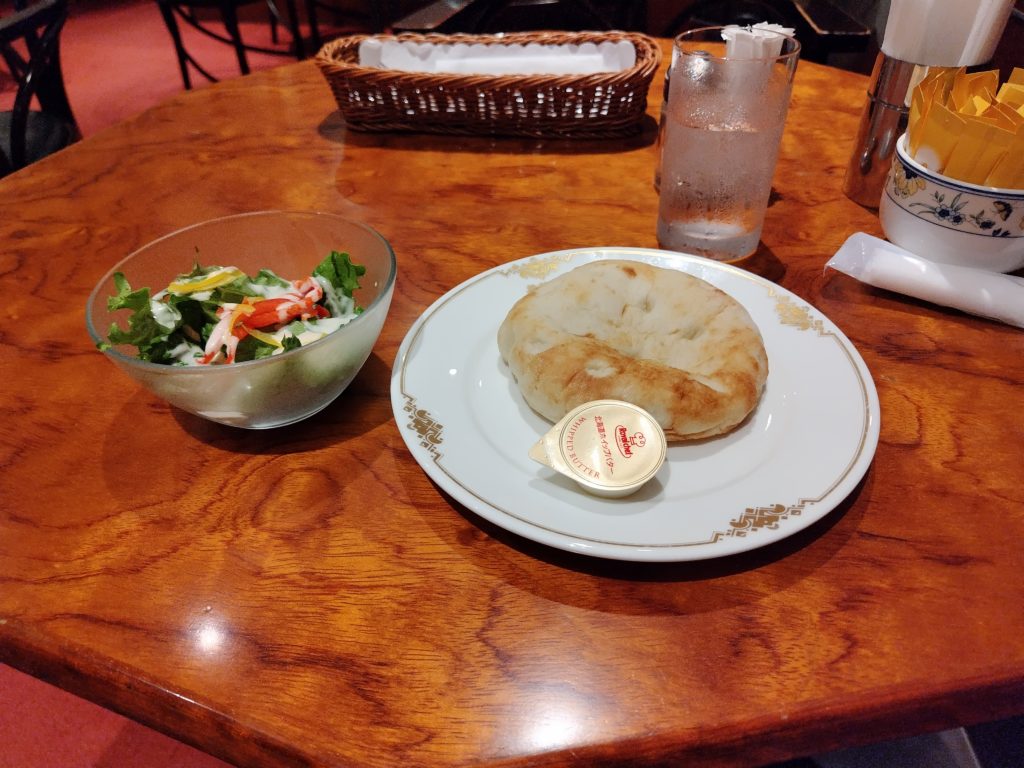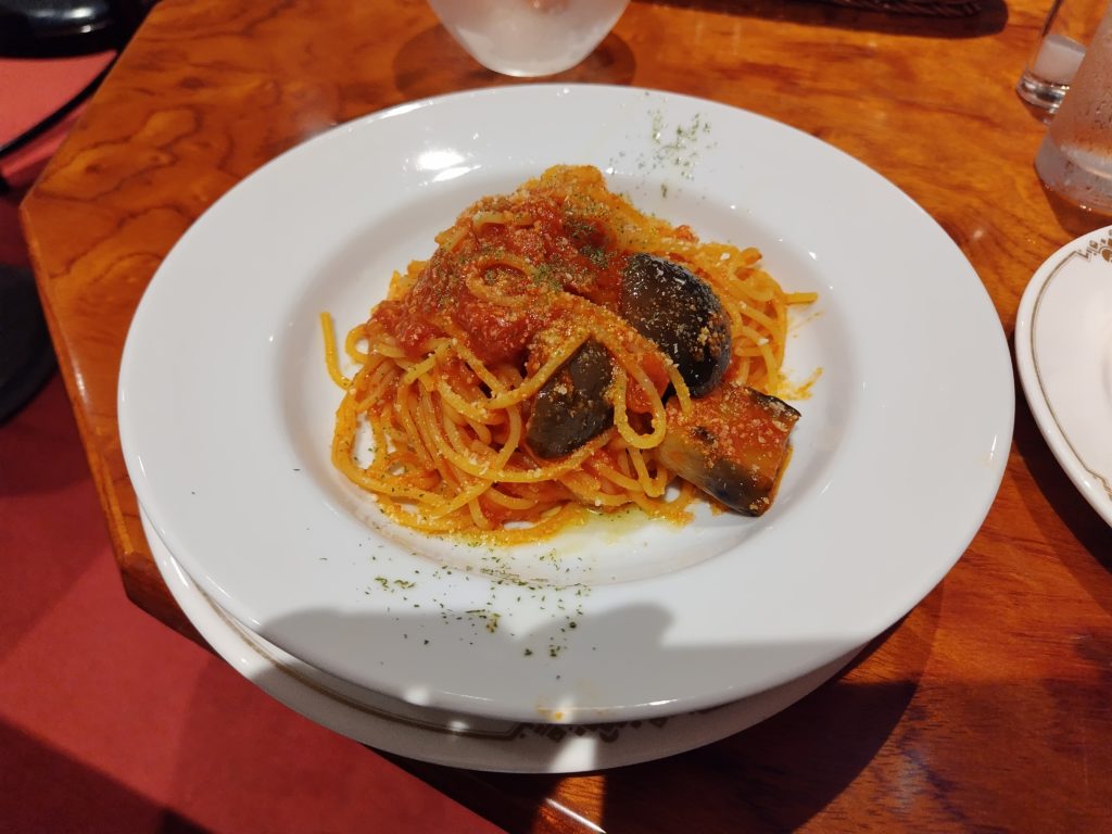 サラダとパンが最初にきて、サラダは少し少な目ですが、ドレッシングが美味しかったです。パンは暖かくバターと一緒にいただくととても美味しいです。パスタはナスのアラビアータで、しっかりした食感とソースの味が大変美味しく文句の無い味でした。ただ、全体として量は少な目で、男性であれば物足りないかもしれません。