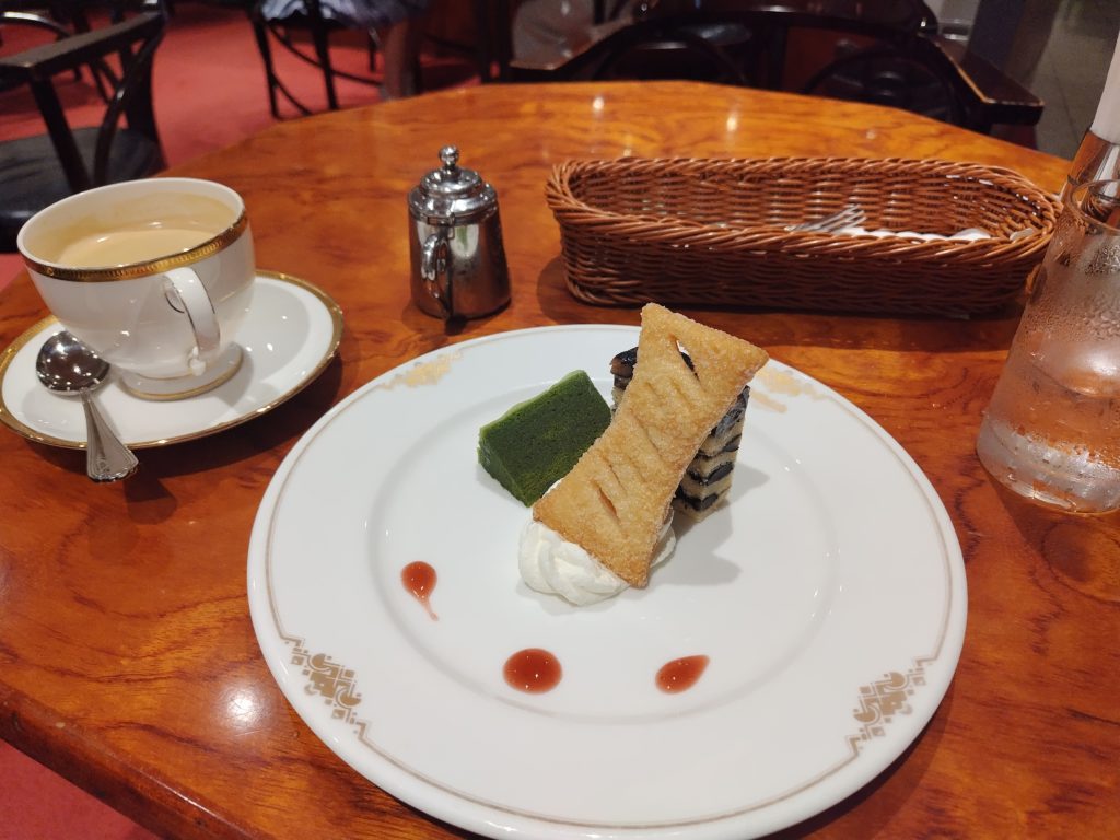 デザートは抹茶のバウムクーヘンと、おそらく黒豆バウムリンデというお菓子と、焼き菓子がついていました。どれも上品な味で甘すぎず、美味しかったです。特に抹茶バウムが私の好みに合っていました。ゆっくりコーヒーを飲み、くつろいでいるうちに他のお客さんもだんだん入ってきました。