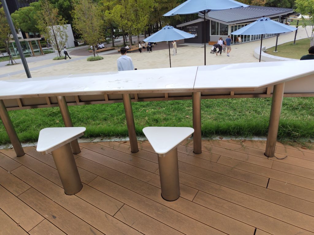 公園には少し高台になっているところにテーブルもあるので、食事もしやすいです。公園の西向いにファミリーマートもあり、ここで食べ物を買うこともできますし、例えば、近場の三宮センター街のサンプラザ地下のカスカードというパン屋さんや、有名なコム・シノワというパン屋さんで買ってきたパンを食べたりしています。