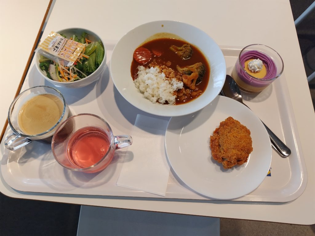 ドリンクバーもあり、200円で本格的なコーヒーマシンのコーヒーも飲めるので、これはお買い得だと思います。勉強したい学生などにとっては最高の場所かもしれません。結局、カレーサラダ、フライドチキンなどを購入しました。カレーは甘口で普通のカレーだなと思いましたが、良い食事でした。