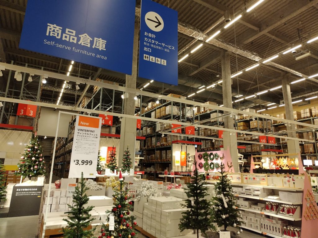 1階の出口近いエリアは巨大な倉庫になっていて、圧巻の光景です。何かワクワクするものがあって、個人的にはここがIKEAで一番好きな場所かもしれません。もうクリスマス用品が売られていて、随分気が早いなと感じました。今回、このあたりで売られていた小物を少し購入しました。