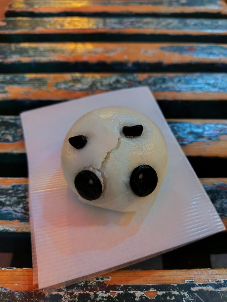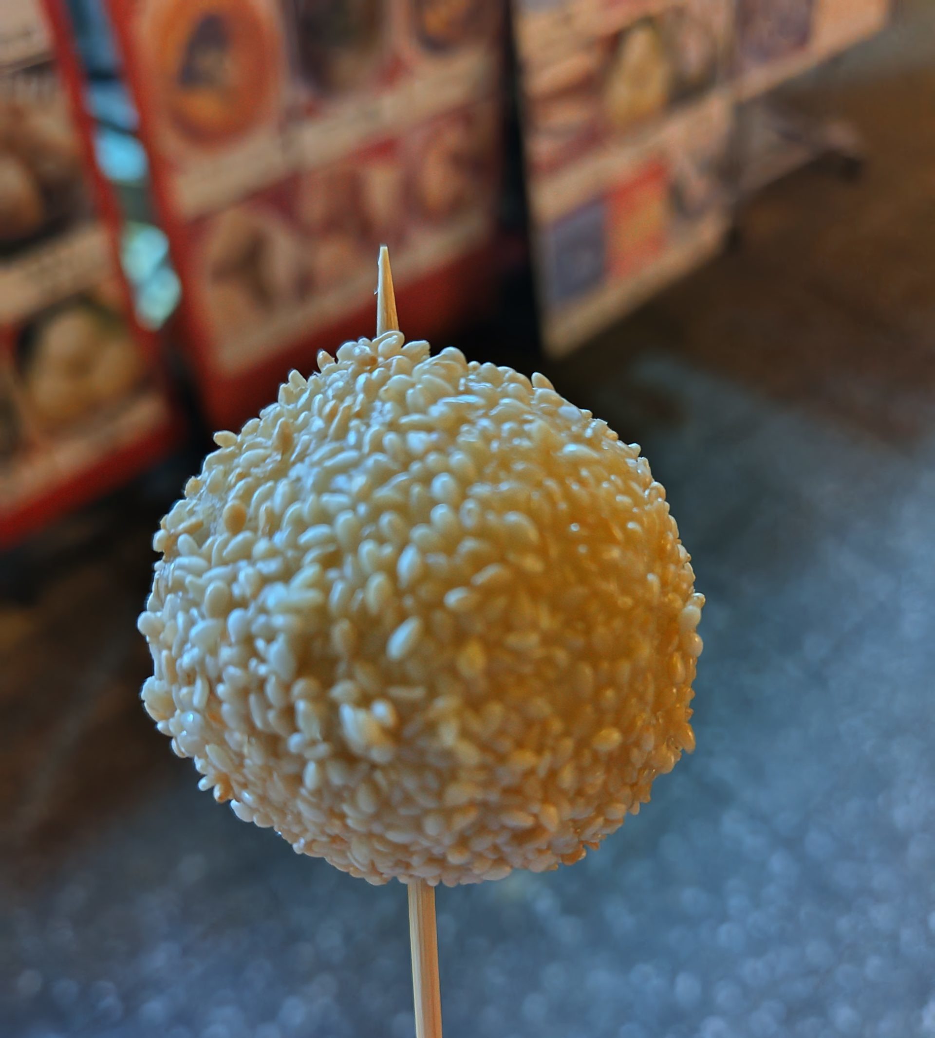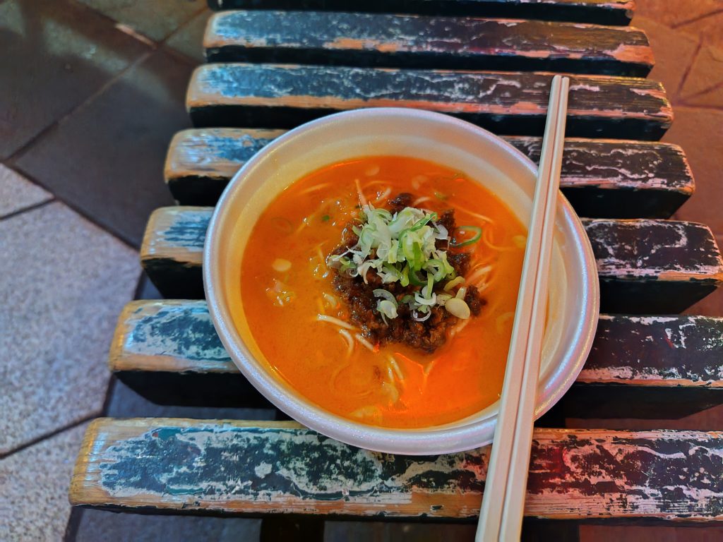 担々麺400円、パンダまん250円をお願いしたのですが、ゴマ団子100円が美味しいよと勧められたので、それもいただきました。最初にゴマ団子を渡されたので、順番はおかしいなという感じですが、こちらから食べました。普通のゴマ団子ですが、特に文句なく普通に美味しいです。
