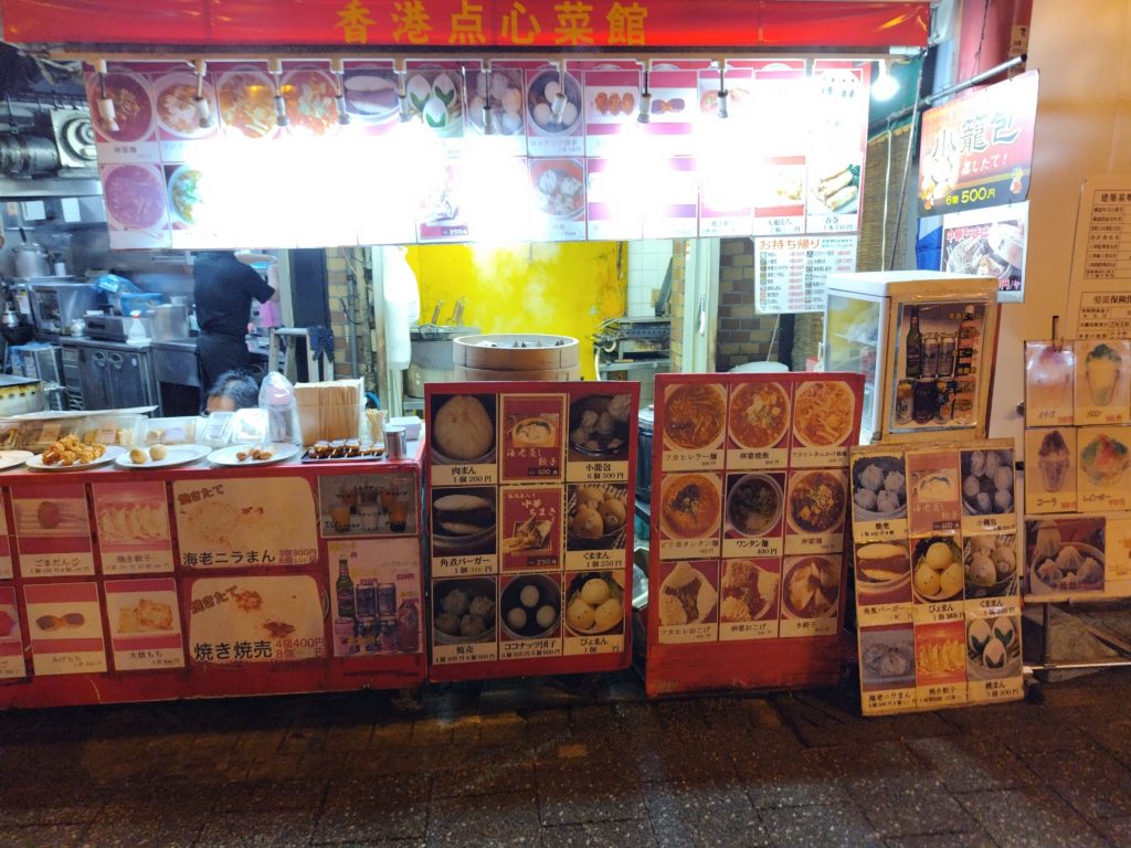 気軽に買い食いをしたいなと思ってきたので、どの店にしようかなと思って歩いていくと、十字路の角にあったこちらのお店に目が留まりました。香港点心菜館というお店です。メニューを見ると、他のお店より少し安めな気がしたので、ここで買ってみようかなと思いました。お店の人は愛嬌のあるおじさんで、やや片言の日本語で宣伝していました。