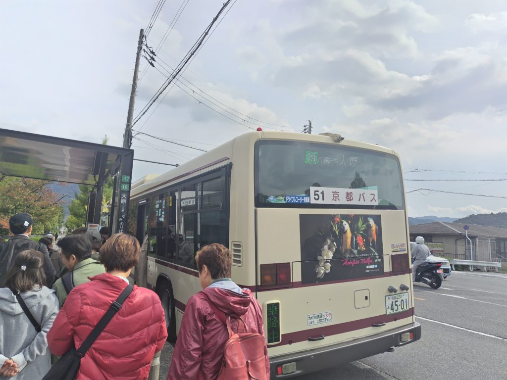 バスはだんだん山の中に入っていき、農村に出ます。大原の駅には20分ほどかかりました。ここが終点なので、分かりやすいですね。バス停には大原女という、昔の行商人のイラストが描かれています。