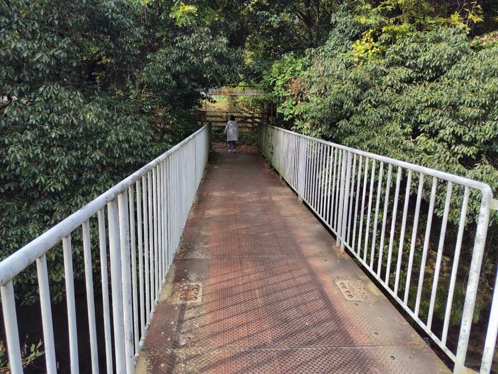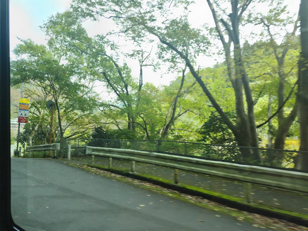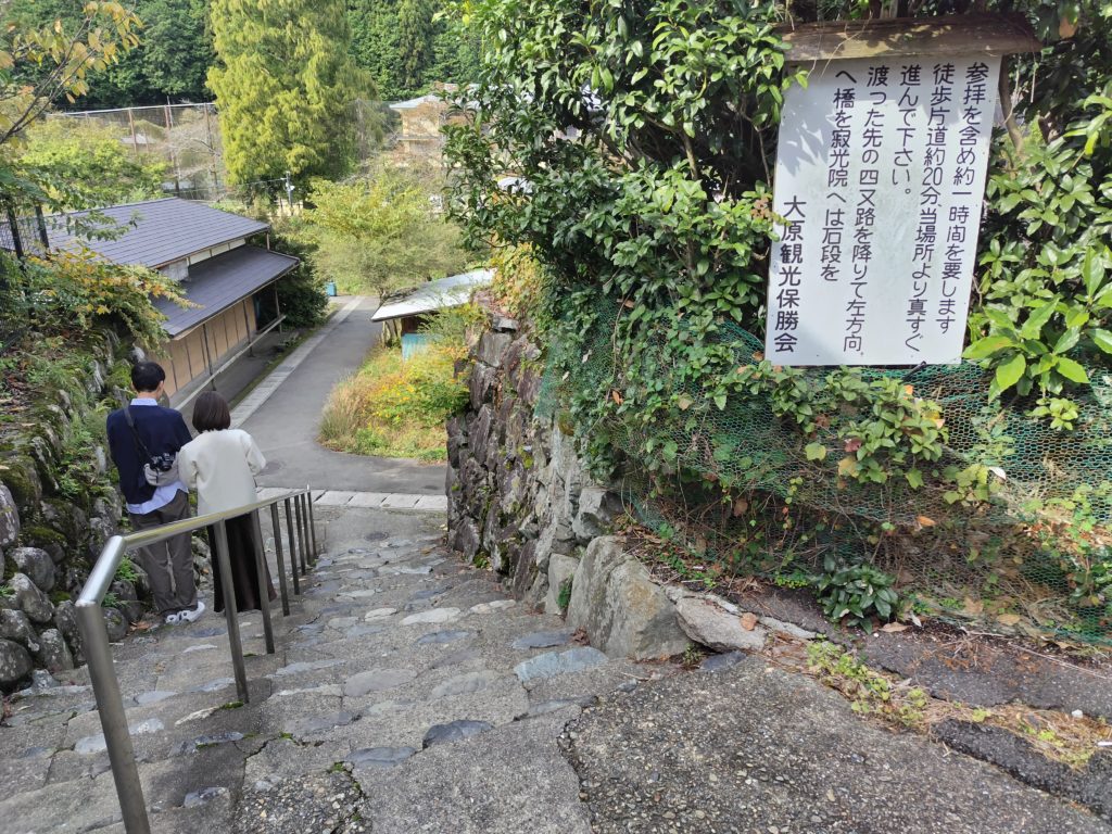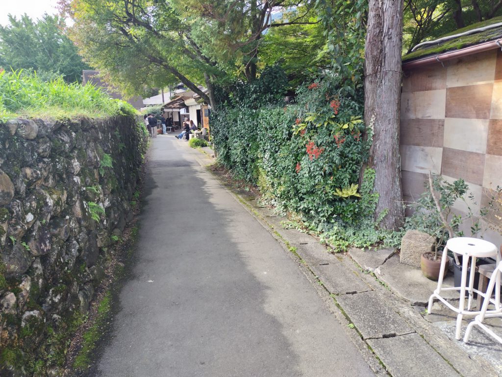 ここから脇の階段を下りて大原山荘に進むのですが、そこそこ距離のある緩やかな坂道で、ゆっくり行くと20分ぐらいかかるかもしれません。大原の自然の景色を楽しみながら進みます。途中にかなり人気のKIRINという飲食店があり、そこだけ人がたくさんいました。そこをさらに進むと、細い橋があり、これを渡り、交差点を抜けてさらにまっすぐ進みます。
