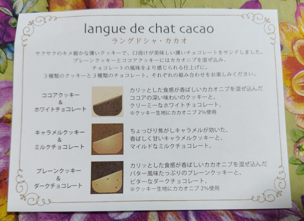 バターがふんだんに使われたかりっとしたクッキーにチョコレートがサンドされています。やはりチョコレートにこだわりが感じられ、豊かな風味を感じます。甘さは強めですが、一口サイズなので、ちょうどよい感じでした。12枚入り1782円で、少し高めですが、おしゃれな包装もあり、お土産などにもちょうどいいのではないでしょうか。