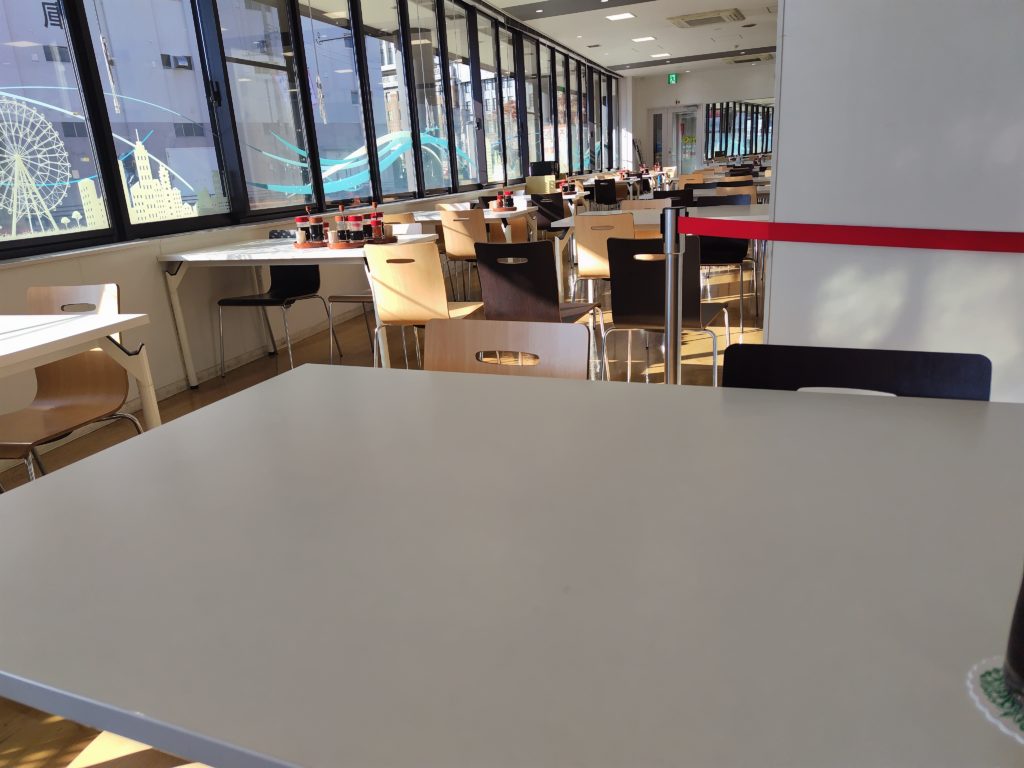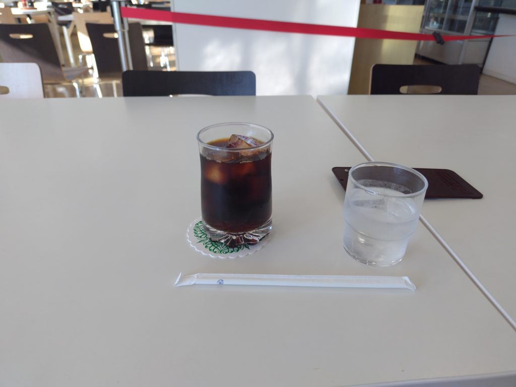ちなみに入った時には他にお客さんはいませんでした。広々としていて良いなと思って座り、アイスコーヒーを注文します。広いのは良いのですが、結構何というか、うどん出汁の匂いが漂っていました。美味しそうな匂いではあり、そのうち鼻が慣れて分からなくなりました。