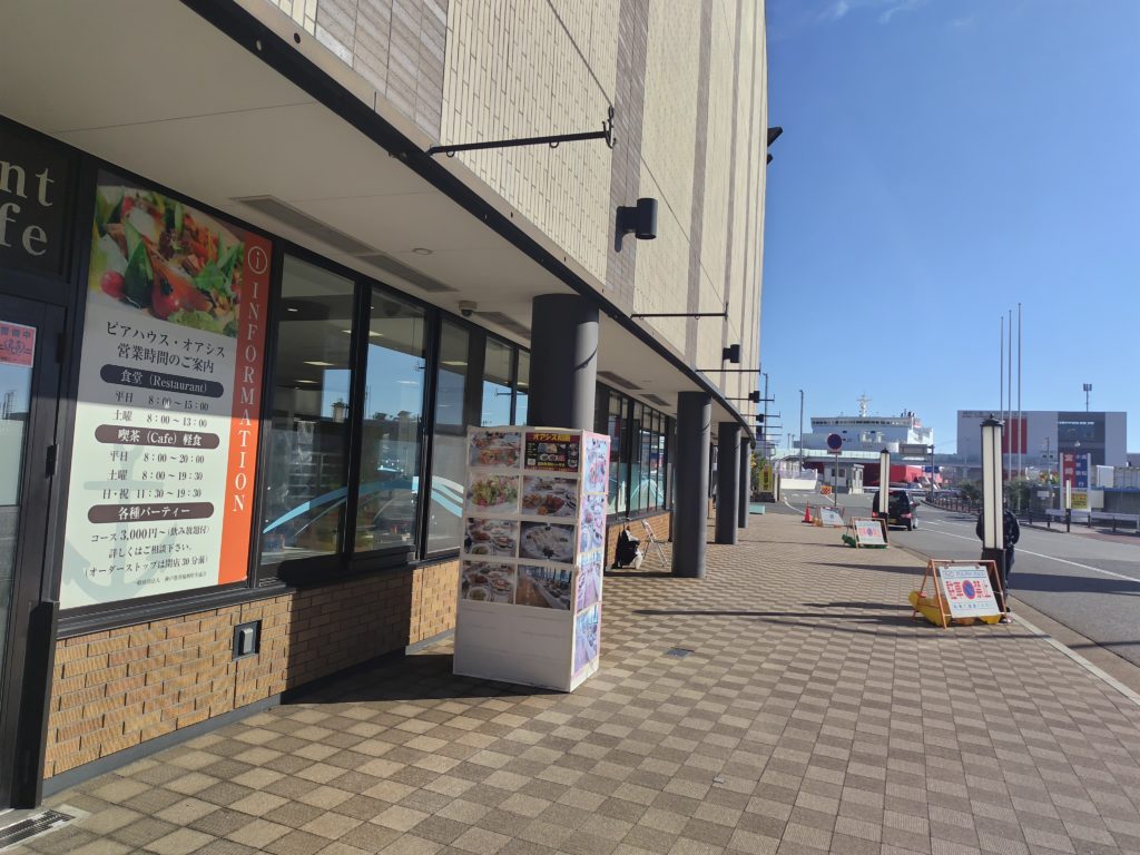 KIITOカフェのあるデザイン・クリエイティブセンター神戸から、さらに海側へ向かって歩くとフェリーターミナルがあるのですが、ここに神戸ポートオアシスというけっこう立派な建物があります。特に目的無く来たのですが、デイリーヤマザキの前にはそこそこ人がいました。