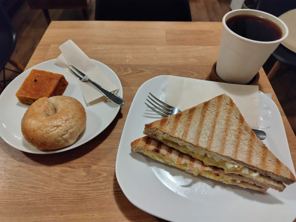 今日はトーストのエッグ&チーズと、ベーグル、カボチャのケーキをいただきました。飲み物はハンドドリップコーヒーMを注文しました。