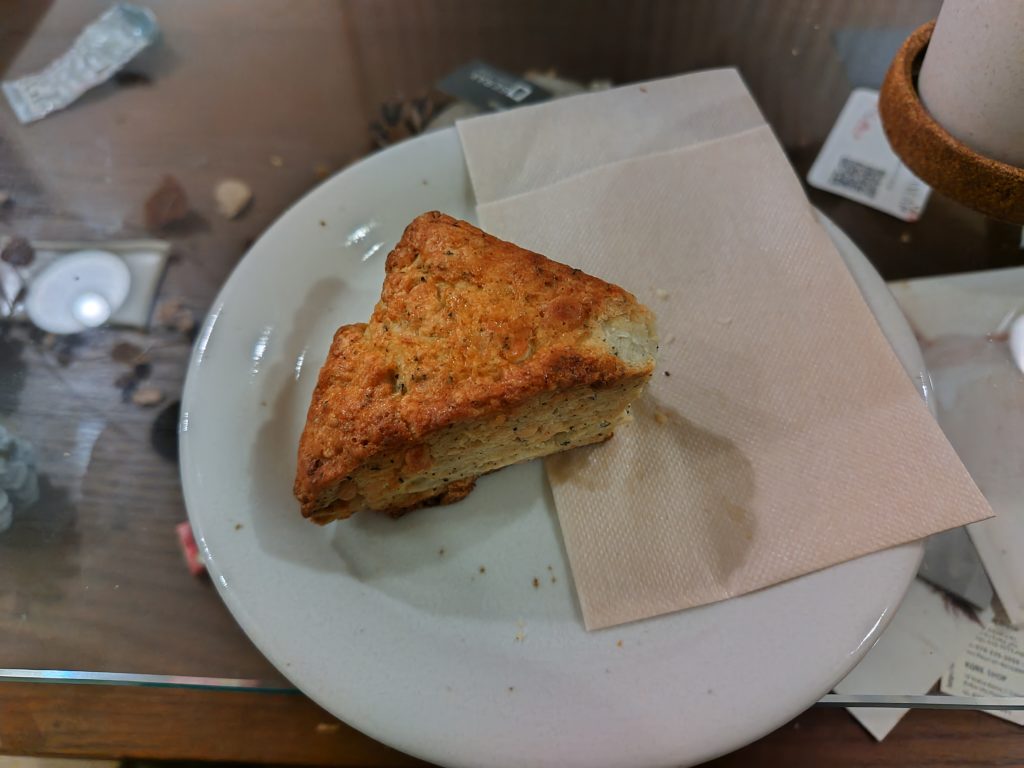 本を読みながらコーヒーをすすっていると、もう少し何か食べたいなと思い、以前いただいてとても美味しかったスコーンをまたいただくことにしました。やはりとても美味しいです。先客が帰られて、2階の客席に一人になったので、透明テーブルの席に移ってゆっくりいただきました。今日も満足でゆったりした時間を過ごさせていただきました。