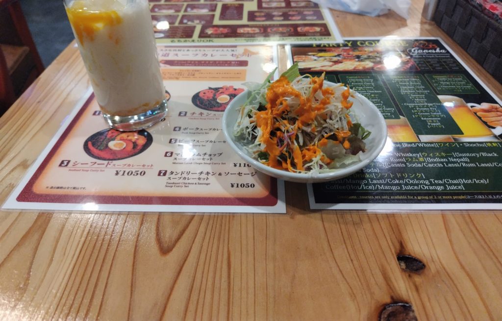 そして、値段ですが、カレー、ナンまたはライス、サラダ、チキンティッカ、飲み物がついたBセットが900円です。最近はどこも値段が上がっているので、1000円以下でこれだけ食べれるのは本当に安いと思います。飲み物はマンゴーラッシーにするのですが、これも久しぶりに飲んでいます(学生のとき飲んで以来?)。とても美味しく、なぜ日本では普通に飲まれていないのだろうと思うぐらいです。食べ終わるとかなり満腹になります。