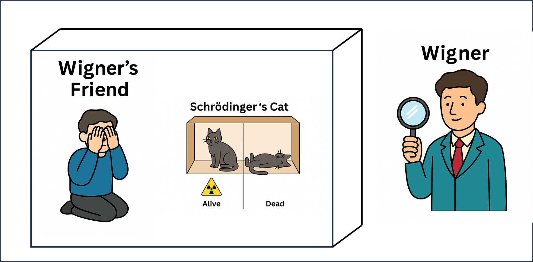 - 猫の生死が、ウィグナーの友人とウィグナーにとっての共通の現実として確定する。