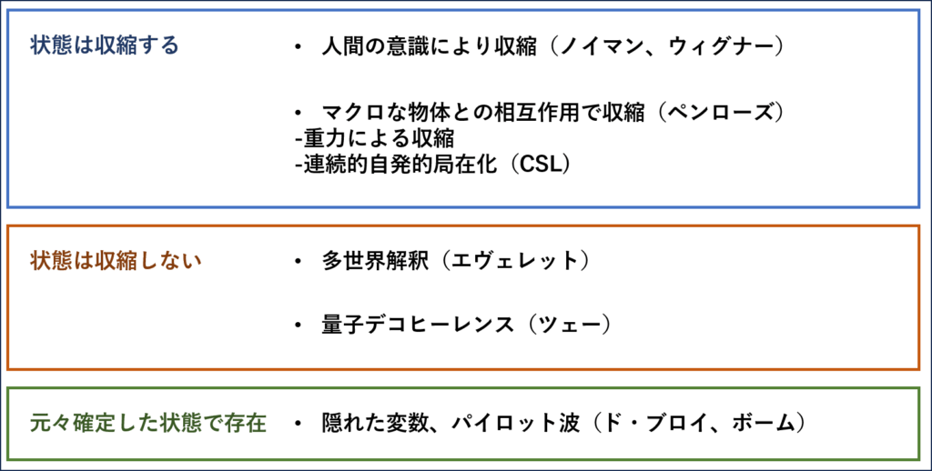 実は状態の収縮(確定)が無いとする立場もあります。下はそれらの他に提唱されている考え方も含め整理した図になります。